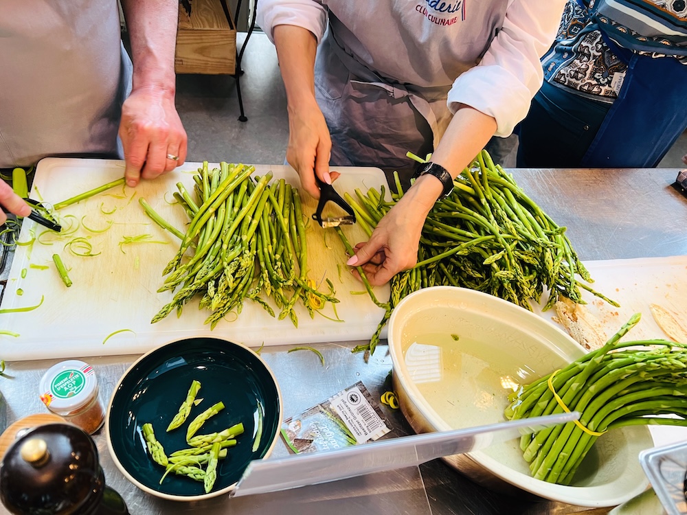Dann stellt Claude das 4-Gang-Menü vor und erklärt den Ablauf des Abends. Anschließend geht es in kleinen Gruppen an die Zubereitung der Gerichte – Schritt für Schritt, unter professioneller Anleitung. Leihschürzen liegen bereit. Wenn ihr als Gruppe kommt, verteilt euch auf verschiedene Teams, um möglichst viel Wissen und Techniken mitzunehmen.